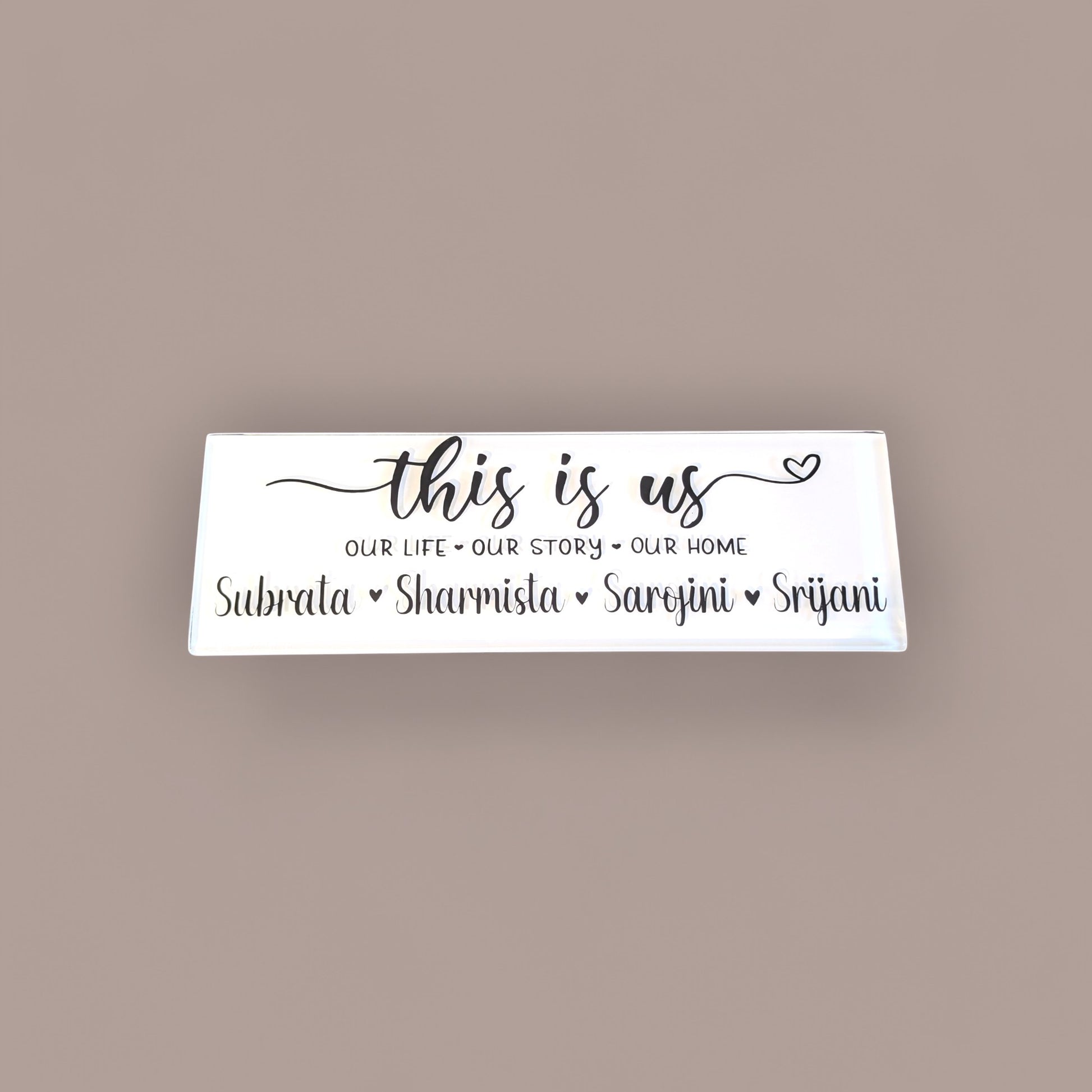 Impress your guests with our personalized glass plaque, proudly displaying the phrase "This is us." Not only is it a thoughtful gift for your loved ones, but it also adds a touch of elegance to your home. Choose from our selection of designs and personalize it with your desired names. Don't see a design you like? No problem, send us a message and we'll work together to create a custom design just for you!
